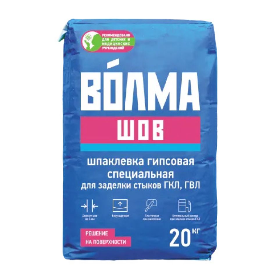 «ВОЛМА-Шов» — сухая шпатлевочная смесь на основе натурального гипса, минерального наполнителя и модифицирующих добавок.